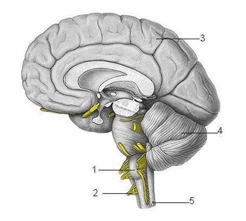 1. Hành não 2. Dây thần kinh ngoại biên 3. Đại não 4. Tiểu não 5. Tủy gai