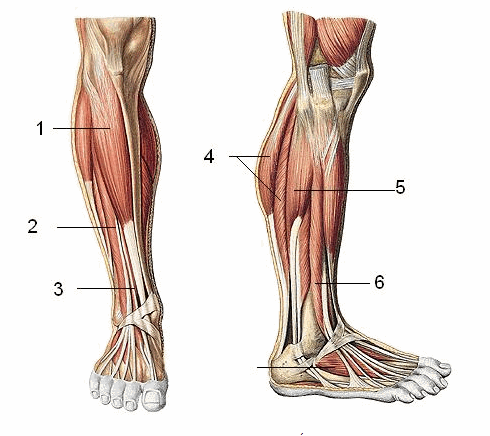 1. Cơ chày trước 2. Cơ duỗi các ngón dài 3. Cơ duỗi dài ngón cái 4. Cơ tam đầu 5. Cơ mác dài 6. Cơ mác ba