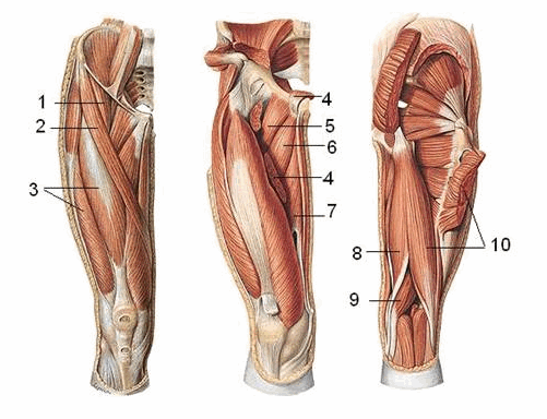 1. Cơ thắt lưng chậu 2. Cơ may 3. Cơ tứ đầu 4. Cơ khép dài 5. Cơ lược 6. Cơ khép ngắn 7. Cơ khép lớn 8. Cơ bán gân 9. Cơ bán màng 10. Cơ nhị đầu đùi