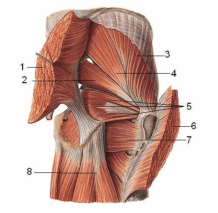 1 và 6. Cơ mông lớn 2. Cơ hình lê 3. Cơ mông nhỡ 4. Cơ mông bé 5. Cơ bịt trong và hai cơ sinh đôi 7. Cơ vuông đùi
