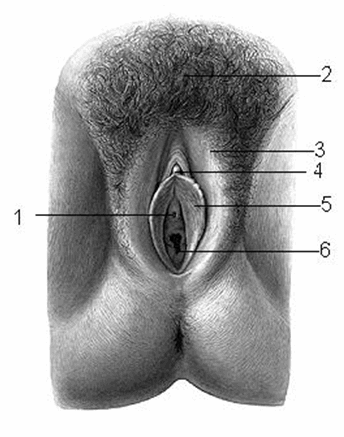 1. Lỗ niệu đạo ngoài 2. Gò mu 3. Môi lớn 4. Âm vật 5. Môi bé 6. Lỗ màng trinh