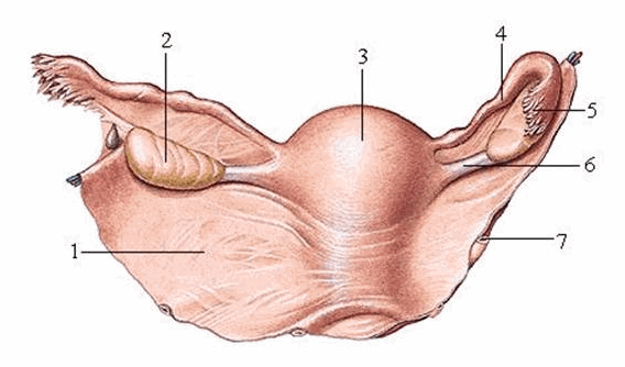 1. Dây chằng rộng 2. Buồng trứng 3. Tử cung 4. Vòi tử cung 5. Tua vòi 6. Dây chằng riêng buồng trứng 7. Niệu quản