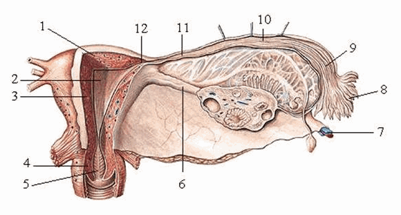 1. Đáy tử cung 2. Buồng tử cung 3. Thân tử cung 4. Cổ tử cung 5. Ống cổ tử cung 6. Dây chằng riêng buổng trứng 7. Động mạch và tĩnh mạch buồng trứng 8. Tua vòi 9. Phễu vòi 10. Bóng vòi 11. Eo vòi 12. Phần tử cung