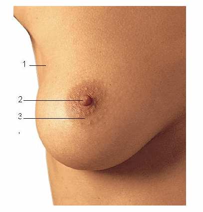 1. Cơ ngực lớn 2. Núm vú 3. Quầng vú