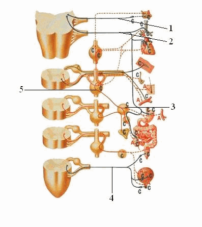 1. Dây thần kinh IX 2. Dây thần kinh X 3. Hạch tạng 4. Sợi đối giao cảm chậu 5. Hạch cạnh sống