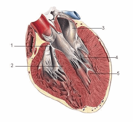 1. Phần màng vách gian thất 2. Phần cơ vách gian thất 3. Val hai lá 4. Thừng gân 5. Trụ cơ