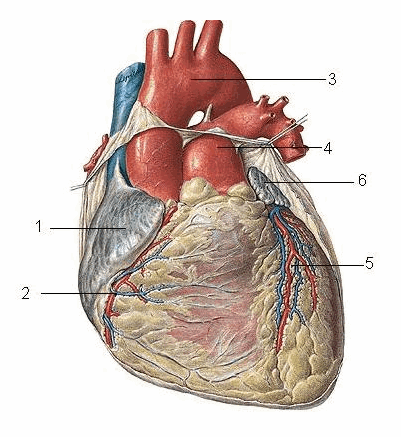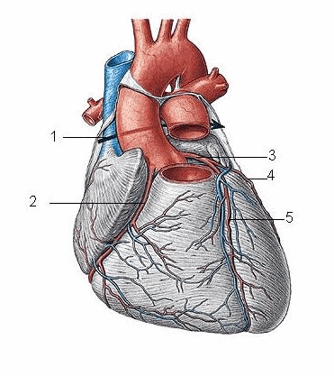 1. Xoang ngang 2.Động mạch vành phải 3. Động mạch vành trái 4. Động mạch mũ tim 5. Động mạch gian thất trước